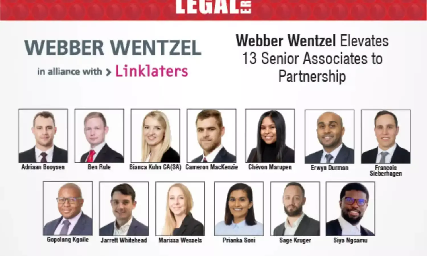 Webber Wentzel elevates 13 senior associates to partnership, recognizing their contributions to client success and firm growth across diverse legal sectors