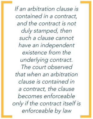 On one hand lies the premise that an arbitration clause is 'severable' from the underlying agreement and therefore, an agreement in itself, while on the other, there is an eventuality of unstamped document being inadmissible as evidence. The Supreme Court held that, in terms of Section 7 of the Arbitration Act, if an arbitration clause is contained in a contract, and the contract is not duly stamped, then such a clause cannot have an independent existence from the underlying contract. The court observed that when an arbitration clause is contained in a contract, the clause becomes enforceable only if the contract itself is enforceable by law. Interestingly, in this regard, the Supreme Court also relied on Section 2 (Interpretation Clause) of the Contract Act, 1872 ("Contract Act"). Section 2(h) of the Contract Act states that "an agreement enforceable by law is a contract". Therefore, the conclusion of the Supreme Court is based on a collective interpretation of Sections 7 & 11(6A) of the Arbitration Act and Section 2(h) in holding that an arbitration clause in an agreement would not exist when it is not enforceable by law.