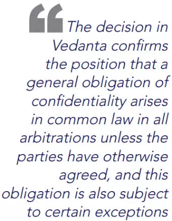 In the recent decision of Republic of India v Vedanta Resources plc [2020] SGHC 208 ("Vedanta") , the Singapore High Court had to consider whether the general obligation of confidentiality extended to both commercial and investment-treaty arbitration. The decision in Vedanta confirms the position that a general obligation of confidentiality arises in common law in all arbitrations unless the parties have otherwise agreed, and this obligation is also subject to certain exceptions.8