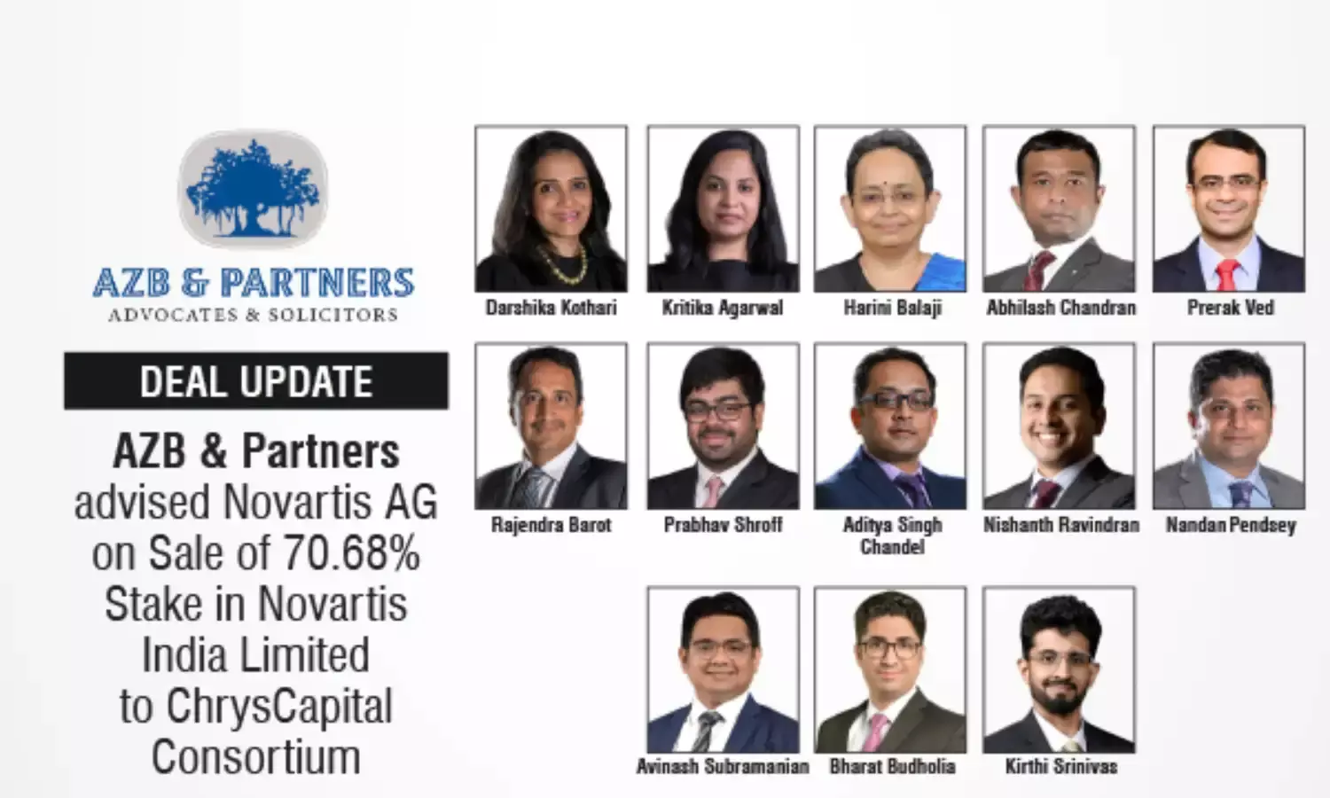 AZB & Partners advised Novartis AG on sale of 70.68% stake in Novartis India to ChrysCapital consortium.