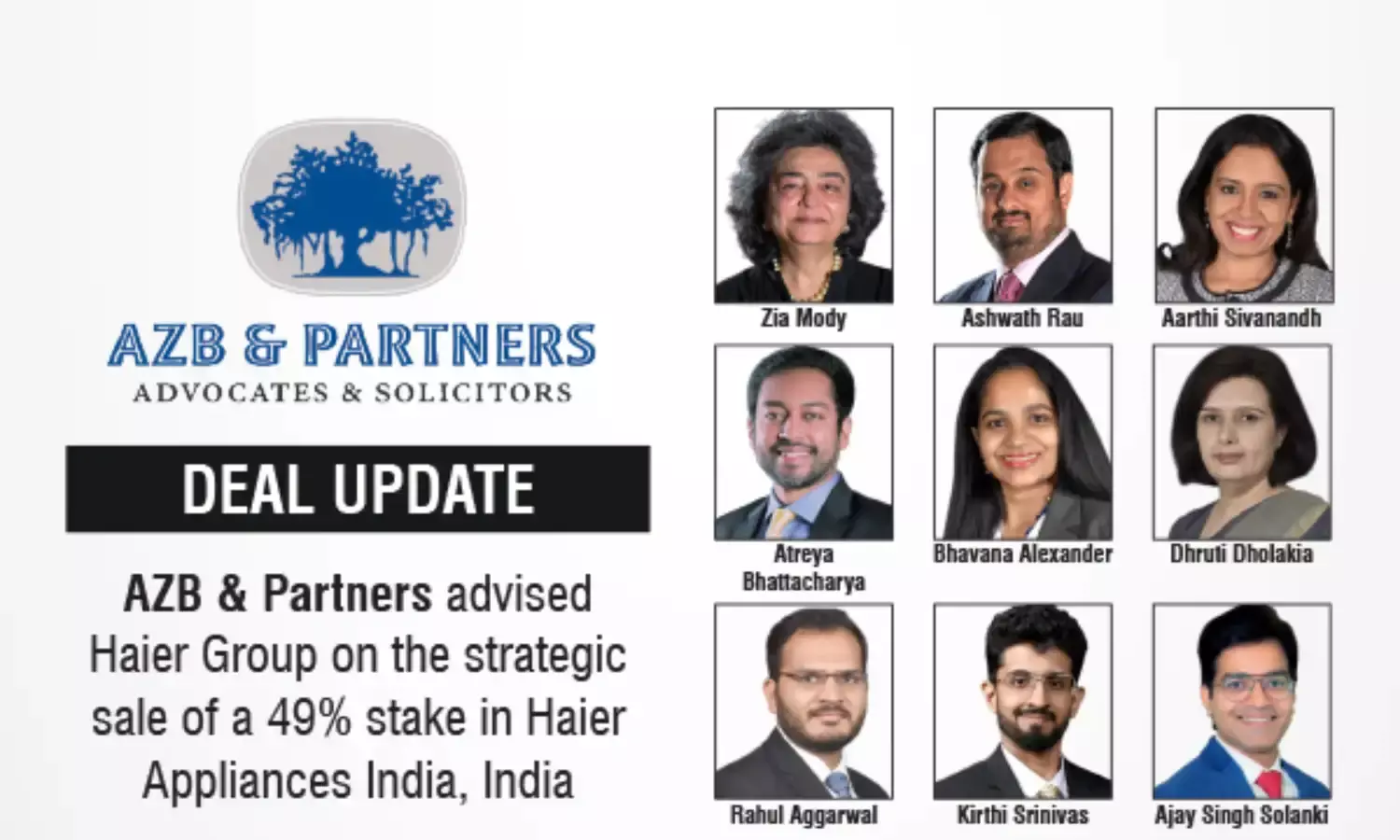 AZB & Partners advised Haier Group on strategic sale of 49% stake in Haier Appliances India to Bharti Enterprises & Warburg Pincus.