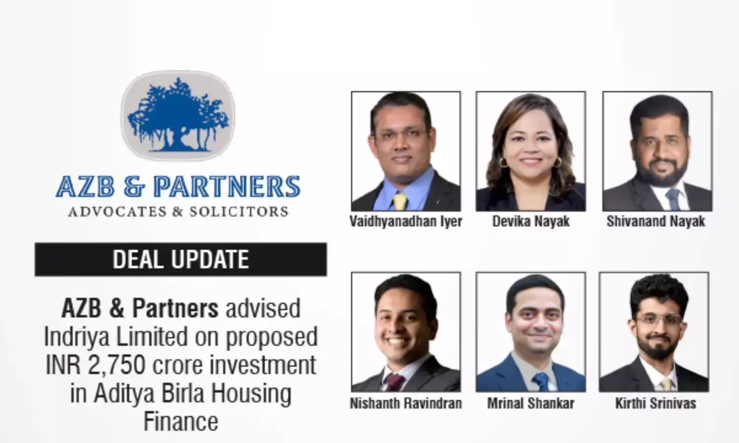 AZB & Partners advised Indriya Limited on its proposed INR 2,750 crore strategic investment in Aditya Birla Housing Finance Limited.