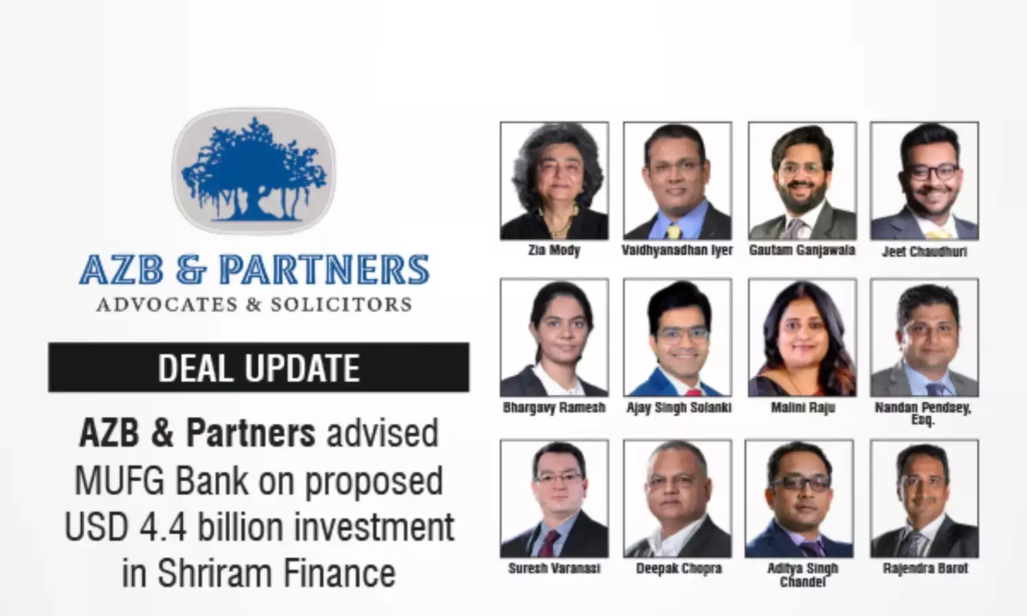 AZB & Partners advised MUFG Bank on proposed USD 4.4B investment in Shriram Finance for a 20% stake.