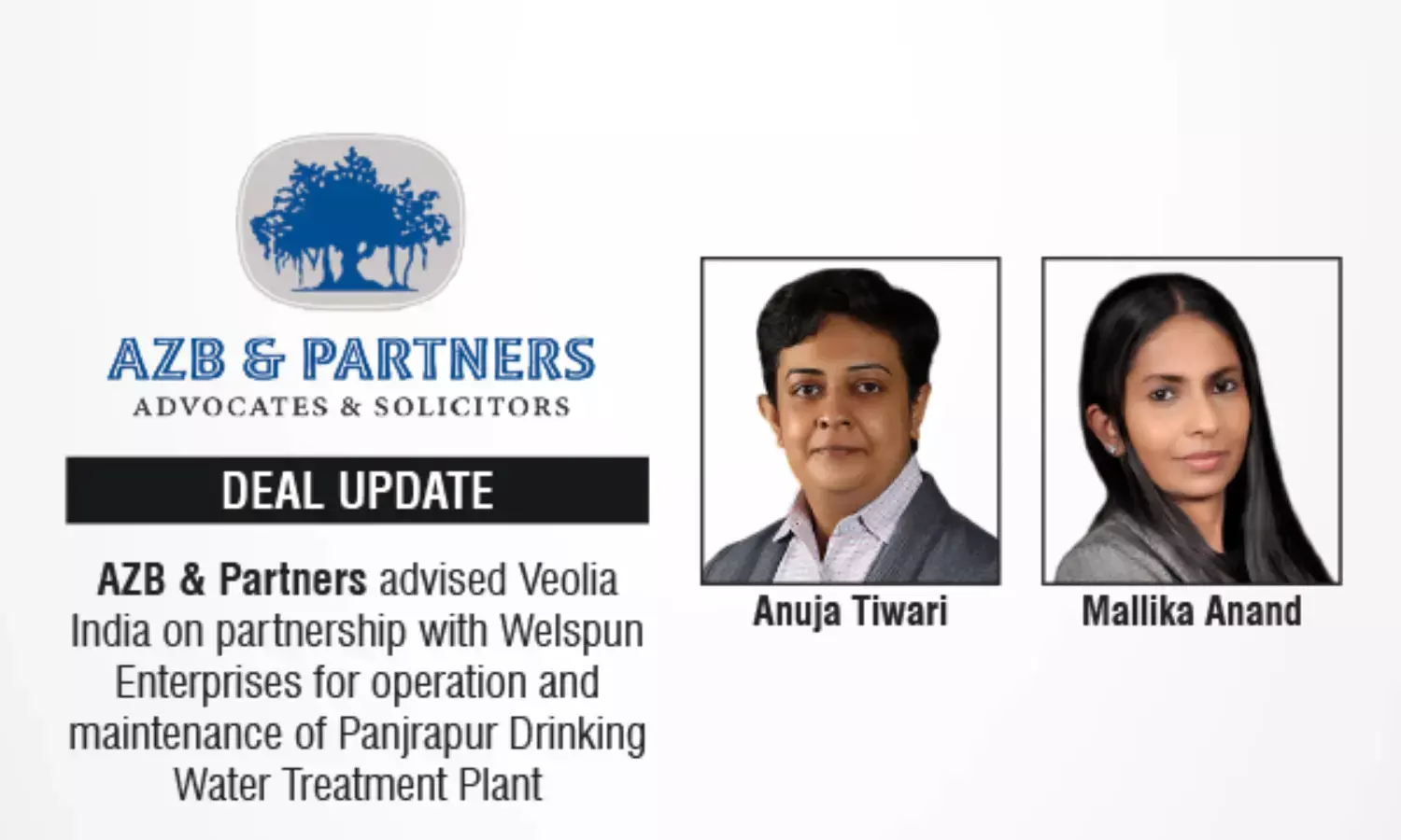 AZB & Partners advised Veolia India on a partnership with Welspun Enterprises for Panjrapur Drinking Water Plant.
