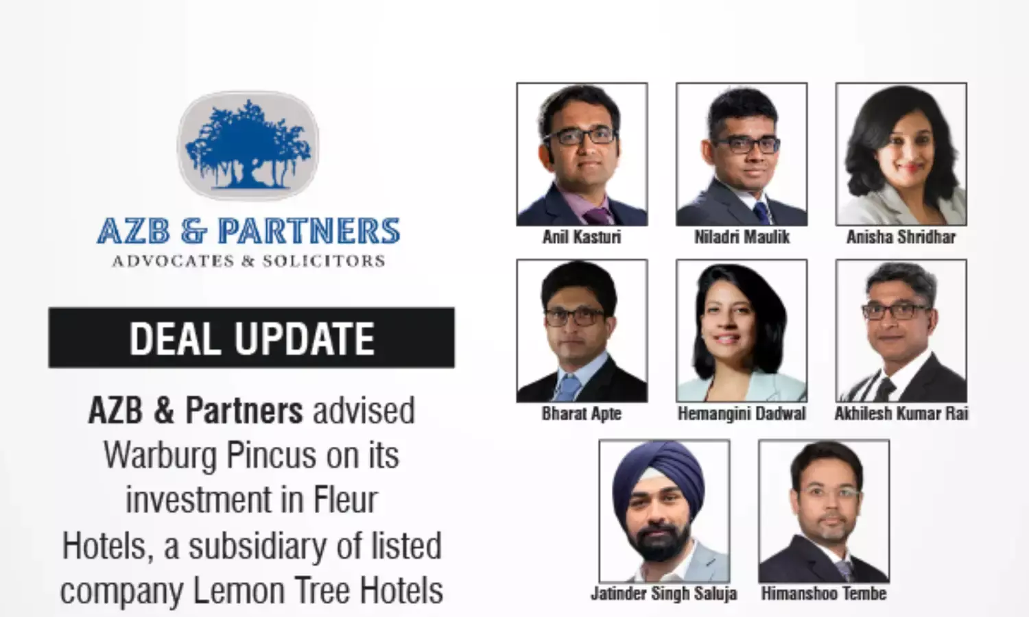 AZB & Partners advised Warburg Pincus on its investment in Fleur Hotels, a subsidiary of Lemon Tree Hotels Limited.