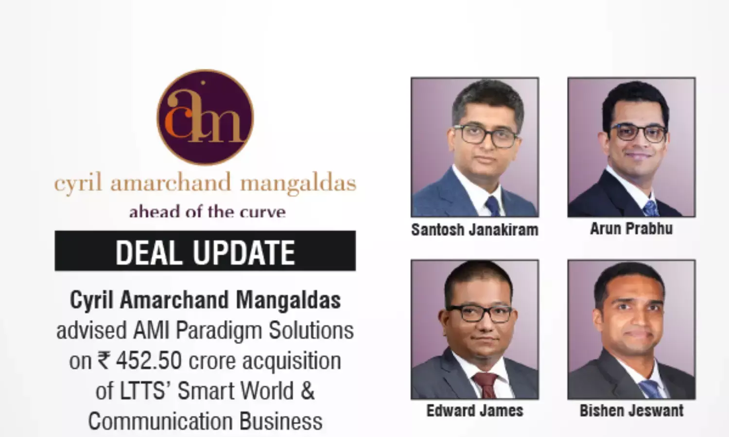 Cyril Amarchand Mangaldas advised AMI Paradigm on ₹452.50 crore LTTS business acquisition.