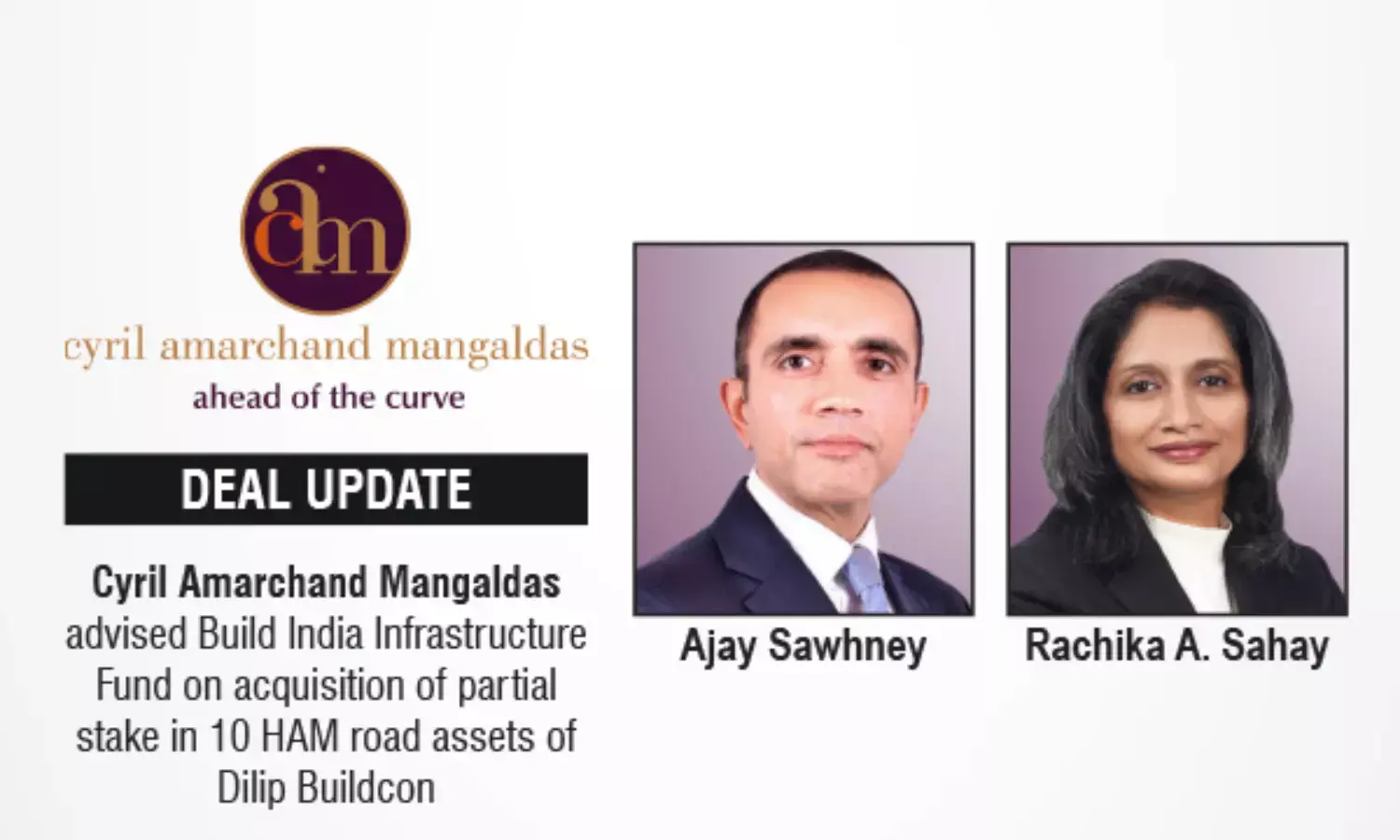 The leading law firm in India, Cyril Amarchand Mangaldas advised Build India Infrastructure Fund on the acquisition of a partial stake, comprising both equity and non-convertible debentures, in 10 HAM road assets of Dilip Buildcon Limited.