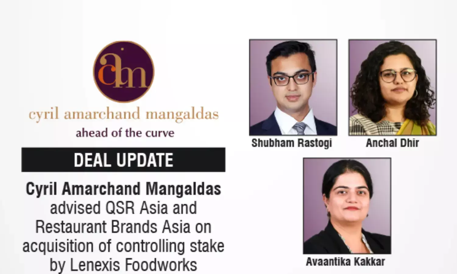 The Cyril Amarchand Mangaldas transaction team advising QSR Asia Pte. Ltd. and the Company was led by Shubham Rastogi (Partner), with assistance from Swini Khara (Senior Associate), Varun Kannan (Senior Associate), and Coral Shah (Associate). Anchal Dhir (Partner) provided strategic inputs on the transaction.