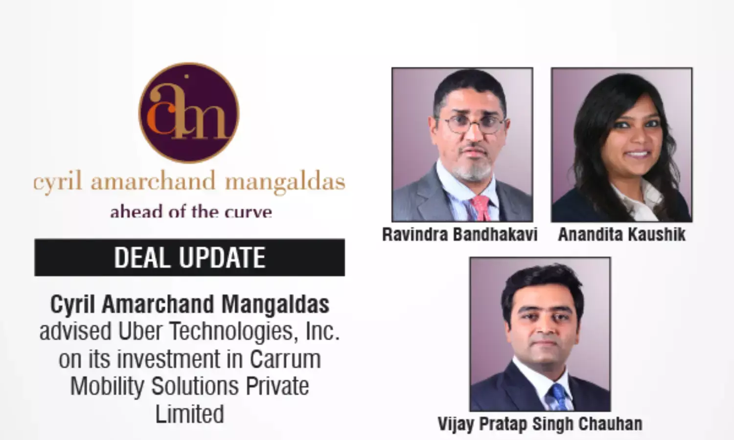 Cyril Amarchand Mangaldas advised Uber on its proposed investment in Carrum Mobility Solutions in India.