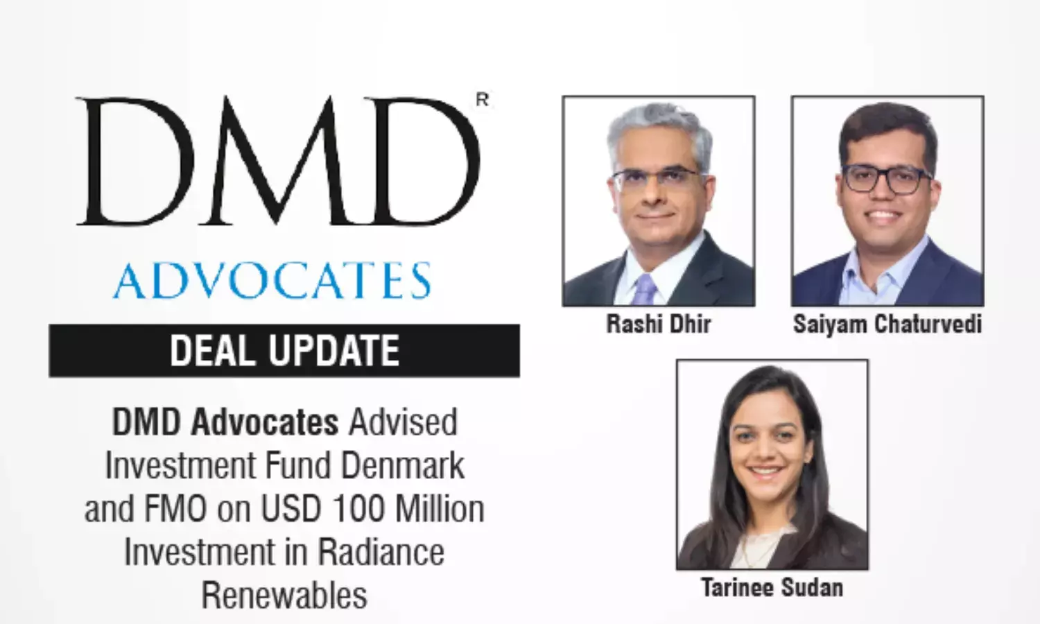 The leading law firm in India, DMD Advocates is advising Investment Fund Denmark (formerly IFU) and FMO, the Dutch Entrepreneurial Development Bank, on their investment in Radiance Renewables Private Limited, a leading India-focused commercial and industrial renewable energy platform backed by Eversource Capital.