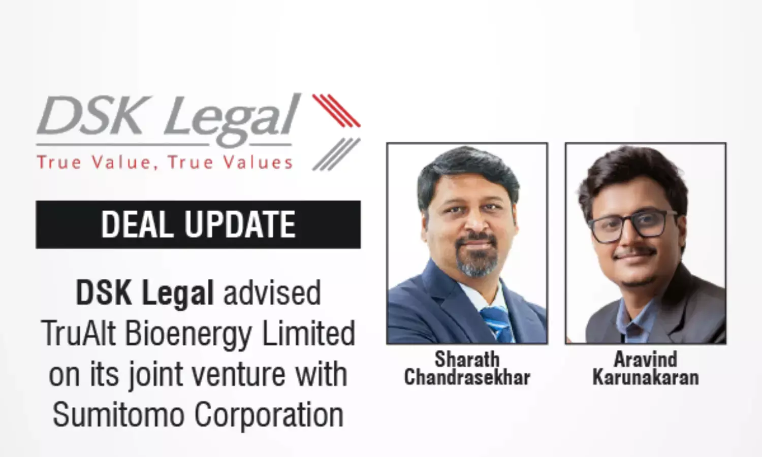 The DSK Legal team was led by Sharath Chandrasekhar (Partner), with support from Aravind Karunakaran (Associate Partner), Srinandini Kar (Associate), and Arjun Malik (Trainee Associate). ZADN & Associates acted as tax advisors for TruAlt, and Talwar Thakore & Associates acted as legal counsel for Sumitomo.