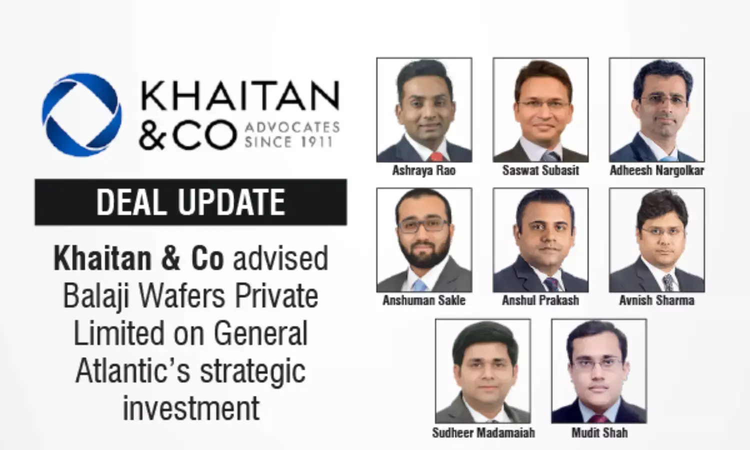Khaitan & Co advised Balaji Wafers on General Atlantic’s strategic minority investment in the leading snacks company.