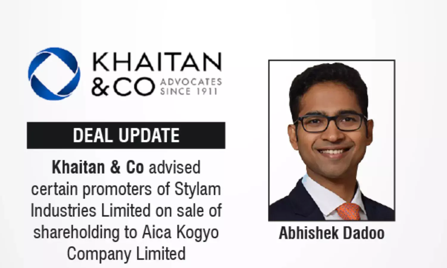 Khaitan & Co advised Stylam Industries promoters on sale of ~40% stake to Aica Kogyo, triggering tender offer.