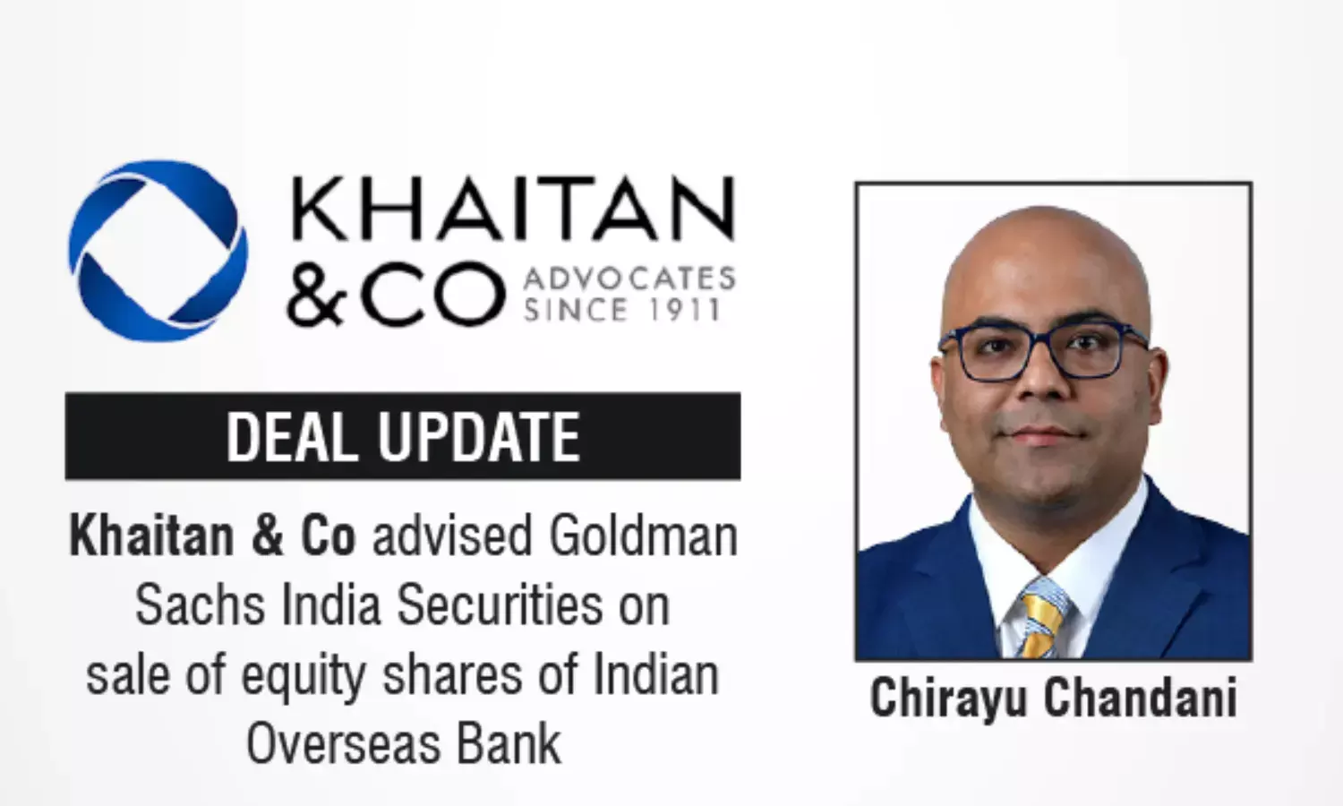 Khaitan & Co advised Goldman Sachs India Securities on sale of Indian Overseas Bank shares worth INR 1,421 crores.