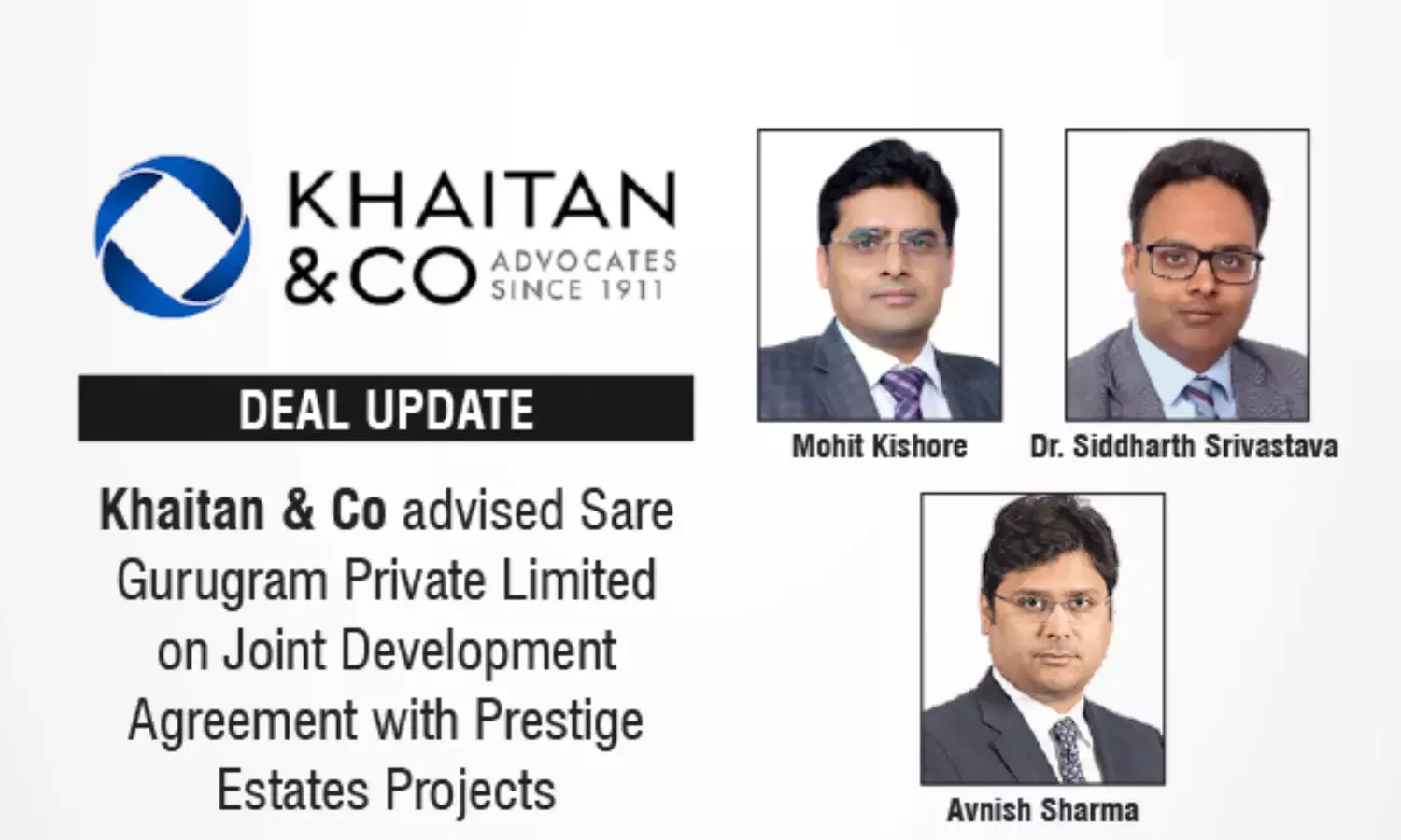 The Khaitan & Co team advising on the transaction included Mohit Kishore (Partner, Insolvency & Restructuring, Banking & Finance) and Shikha Mohini (Senior Associate) leading the transaction, Nilesh Chaudhary (Counsel, Real Estate) on the real estate aspects, and strategic oversight by Dr. Siddharth Srivastava (Partner, Insolvency & Restructuring, Banking & Finance) and Avnish Sharma (Partner, Real Estate).