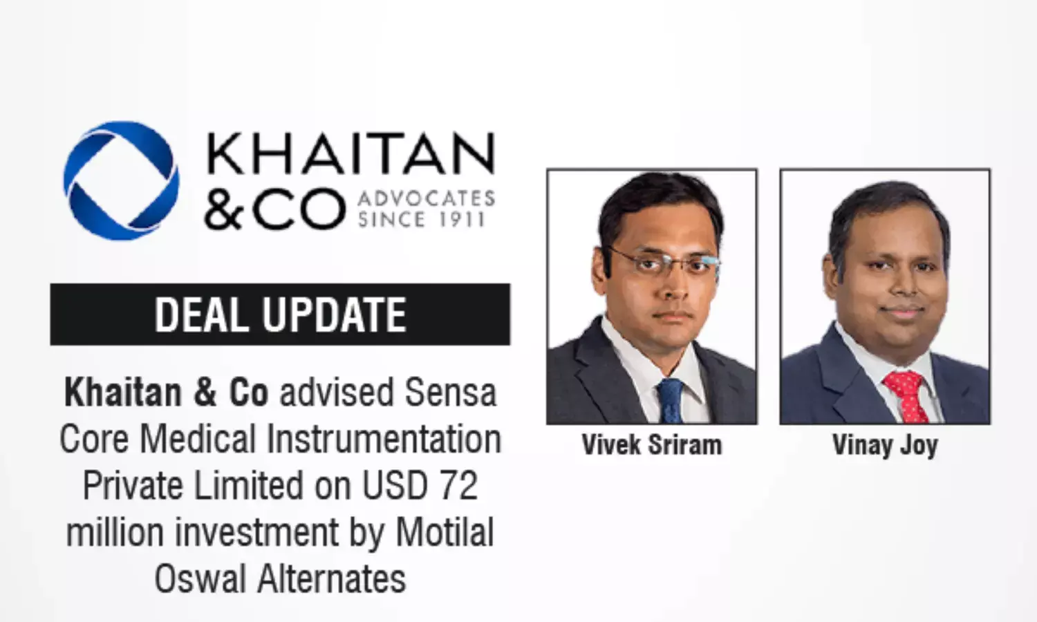 Khaitan & Co advised Sensa Core Medical Instrumentation Private Limited on USD 72 million investment by Motilal Oswal Alternates