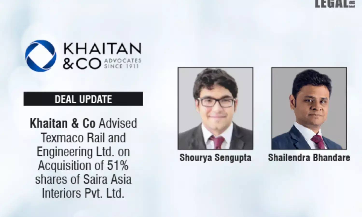 Khaitan & Co advised Texmaco Rail and Engineering Limited (Texmaco) on the acquisition of 51% shares of Saira Asia Interiors