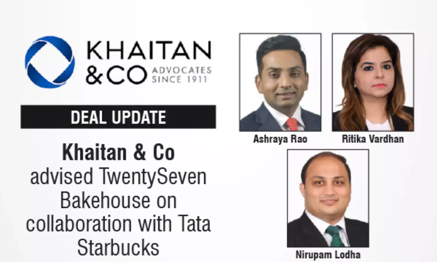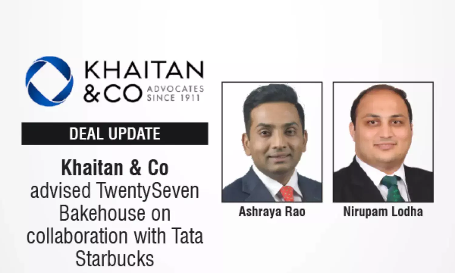 The leading law firm in India, Khaitan & Co advised TwentySeven Bakehouse, a brand under Urban Gourmet India Private Limited, on its collaboration with Tata Starbucks to introduce and supply a curated food portfolio across select Starbucks stores in Mumbai, including the Starbucks Reserve® store and other coffee experiential outlets.
