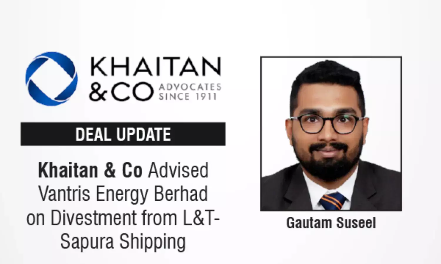 Khaitan & Co advised Vantris Energy Berhad on divestment of its stake in L&T-Sapura Shipping to Larsen & Toubro.