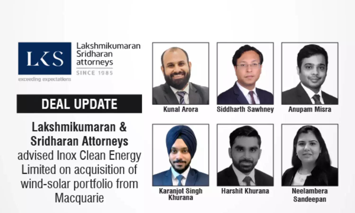 Lakshmikumaran & Sridharan Attorneys advised Inox Clean Energy Limited on the acquisition of a 1,337 MW wind-solar-hybrid renewable energy portfolio from Macquarie.