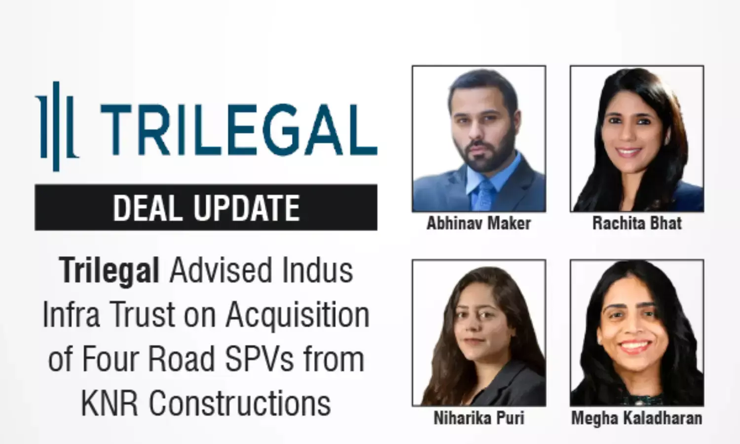 The leading law firm in India, Trilegal advised Indus Infra Trust on the proposed 100% acquisition of four SPVs engaged in the roads sector from KNR Constructions, marking the first acquisition of third-party assets by Indus Infra Trust.