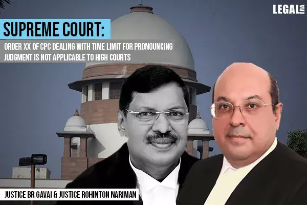 A Bench comprising of Justices Rohinton Nariman and BR Gavai stated in the case of SJVNL (Appellants) v. M/s CCC HIM JV(Respondents) stated that Order XX of Code of Civil Procedure (CPC) which prescribes the time limit for Courts to pronounce judgments will not apply to High Courts (HC).
