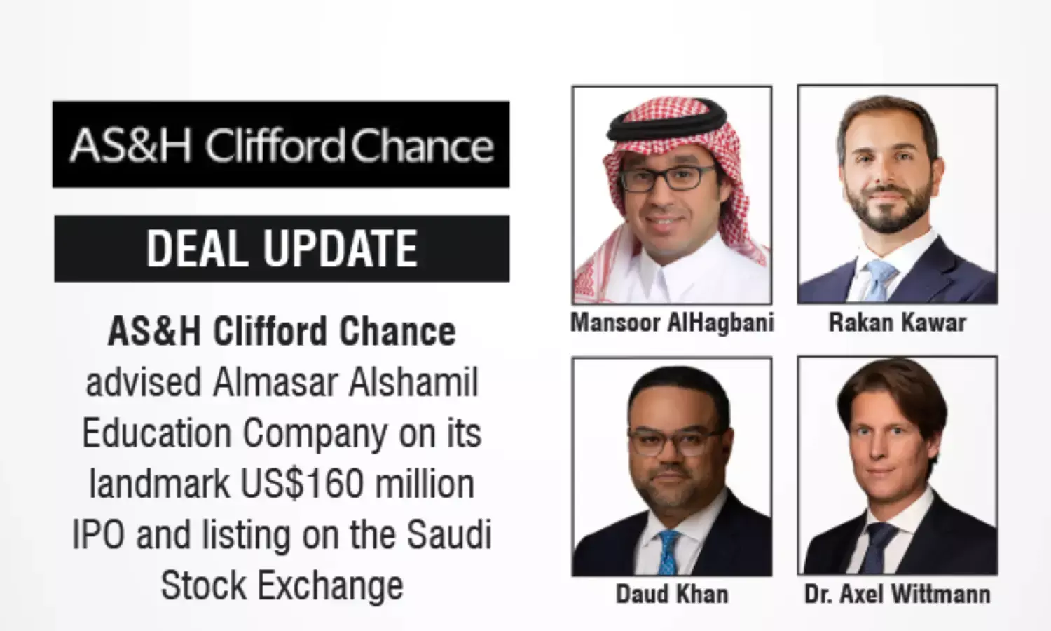 AS&H Clifford Chance advised Almasar Alshamil Education Company on its landmark US$160 million IPO and listing on the Saudi Stock Exchange