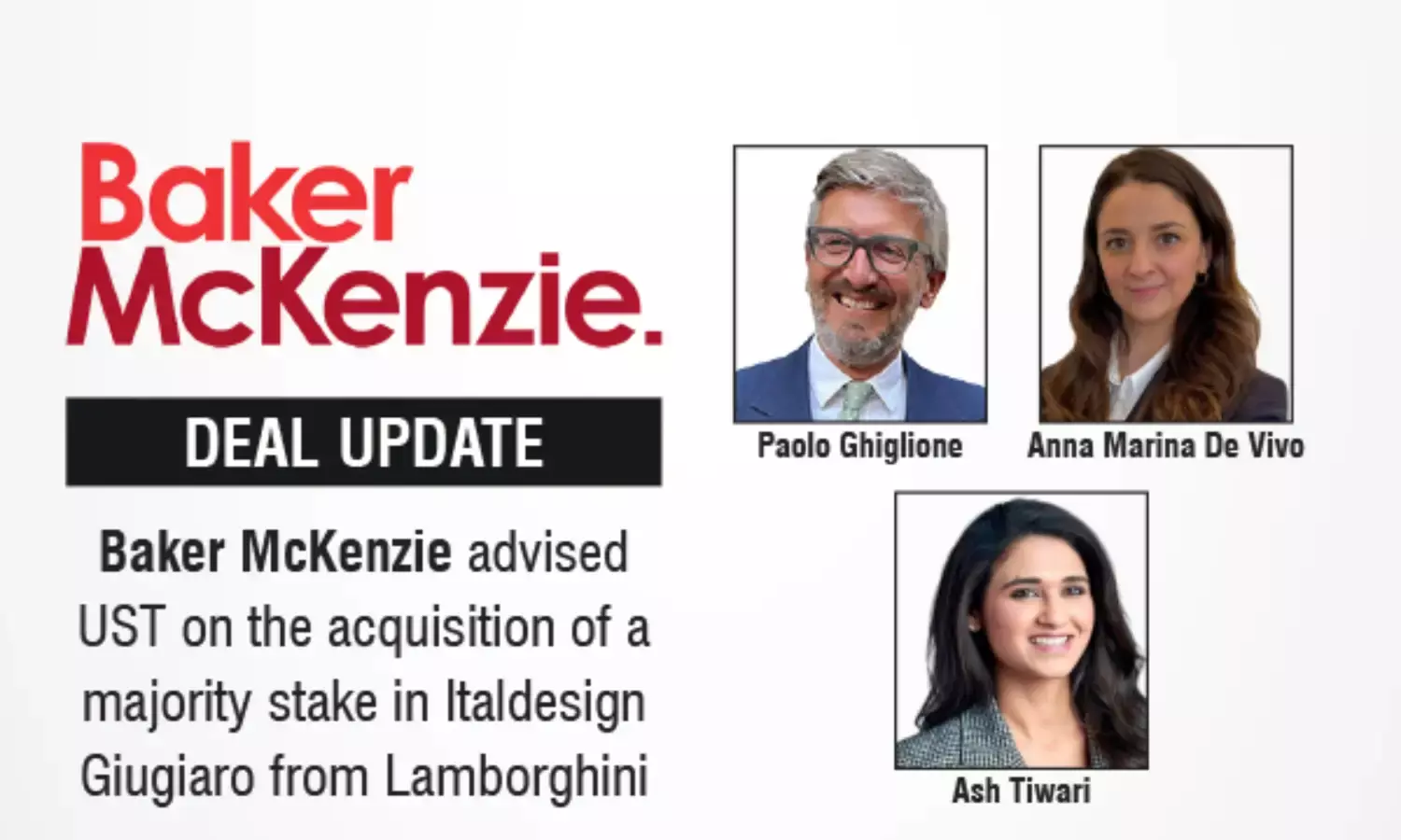 The international law firm Baker McKenzie represented UST, a global technology transformation company headquartered in California, on its acquisition of a majority stake in Italdesign Giugiaro S.p.A., the historic automotive design and engineering firm. Automobili Lamborghini, part of the Audi Group, retains an equity interest, and the Audi Group will remain a long-term strategic partner to ensure continuity in areas that have defined Italdesign’s reputation for over five decades.