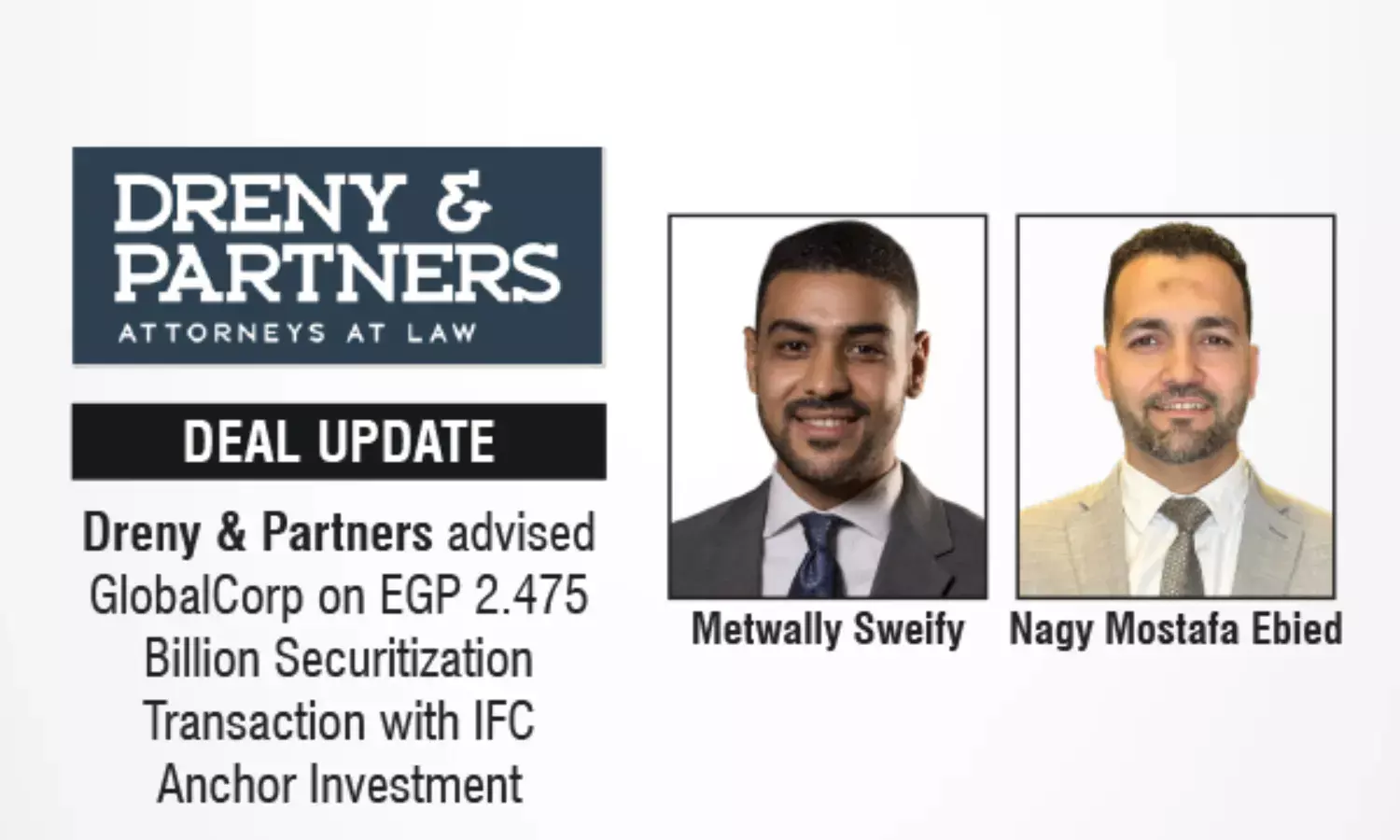 Dreny & Partners advised GlobalCorp on a EGP 2.475B securitization with IFC anchor investment, a regional first.