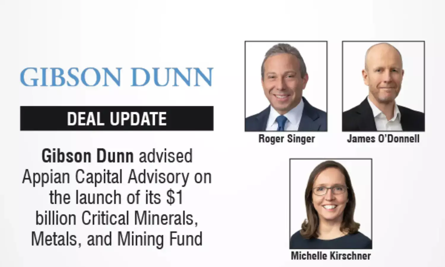 Gibson Dunn advised Appian Capital Advisory on the launch of its $1 billion Critical Minerals Fund.