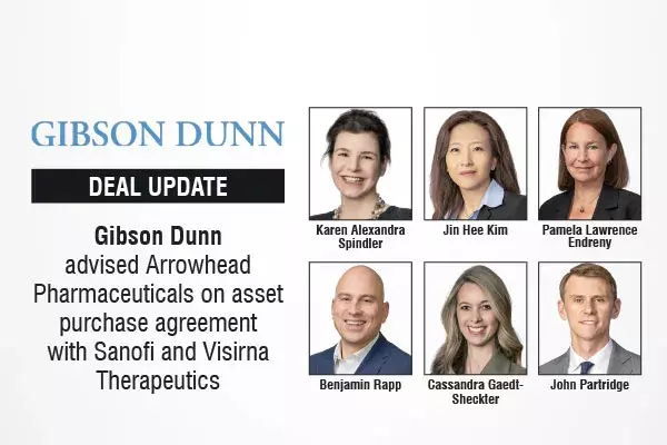 Global law firm Gibson Dunn is advising Arrowhead Pharmaceuticals on an asset purchase agreement between Sanofi and Visirna Therapeutics, a majority-owned subsidiary of Arrowhead. Under the terms of the agreement, Sanofi will acquire rights to develop and commercialize investigational plozasiran in Greater China.