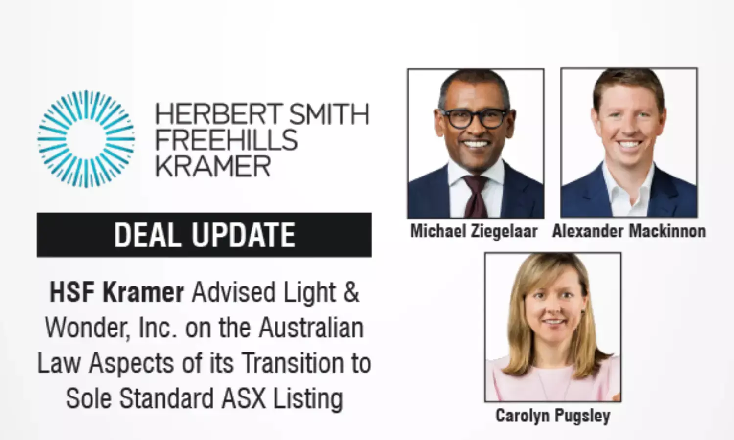 Global leading law firm Herbert Smith Freehills Kramer (HSF Kramer) is pleased to announce that it has advised Light & Wonder, Inc. (ASX: LNW) (Light & Wonder) on its transition to a sole standard listing on the ASX. Light & Wonder began trading on ASX as a standard listing at 10:00am on Friday, 14 November 2025.