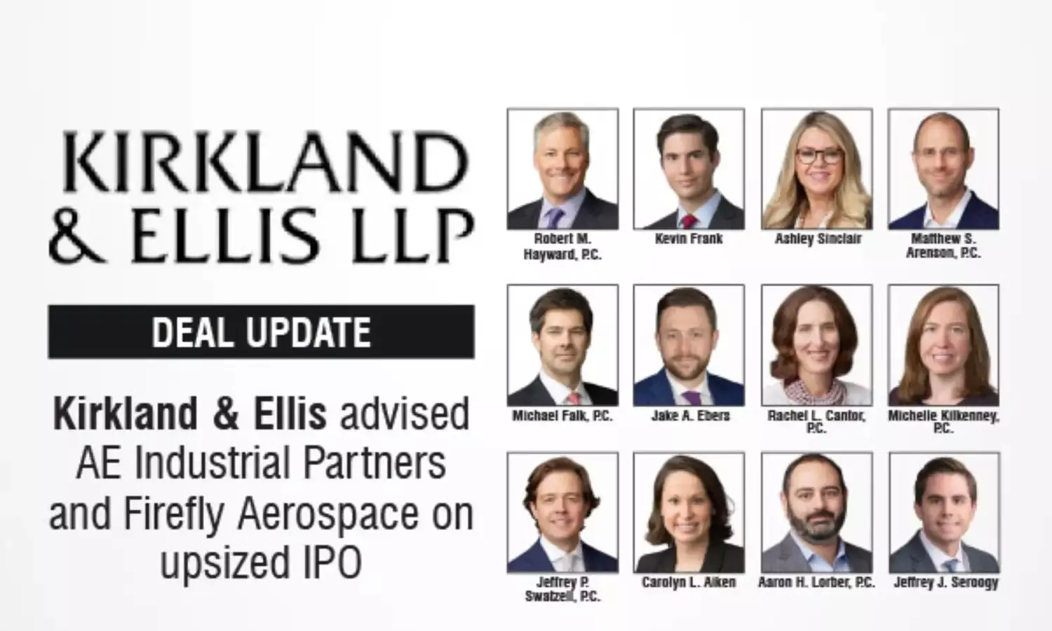 Kirkland & Ellis advised AE Industrial Partners and Firefly Aerospace on a landmark upsized IPO of 19.3 million shares at $45 per share. Firefly’s Nasdaq debut saw a 34% surge, marking a record in space and defense tech IPOs.