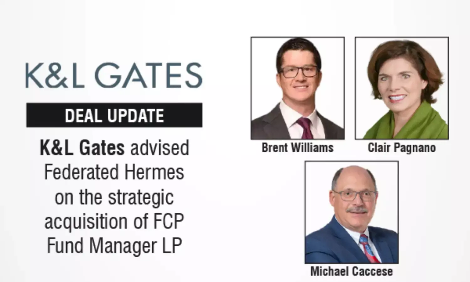 “On behalf of Federated Hermes, we would like to thank K&L Gates for their expert advice, counseling, and active support in the lead up to, and execution of, the definitive transaction agreement between Federated Hermes and FCP Fund Manager LP. We look forward to continuing to work with K&L Gates towards a successful closing of the transaction,” said George Magera, General Counsel, Federated Hermes.