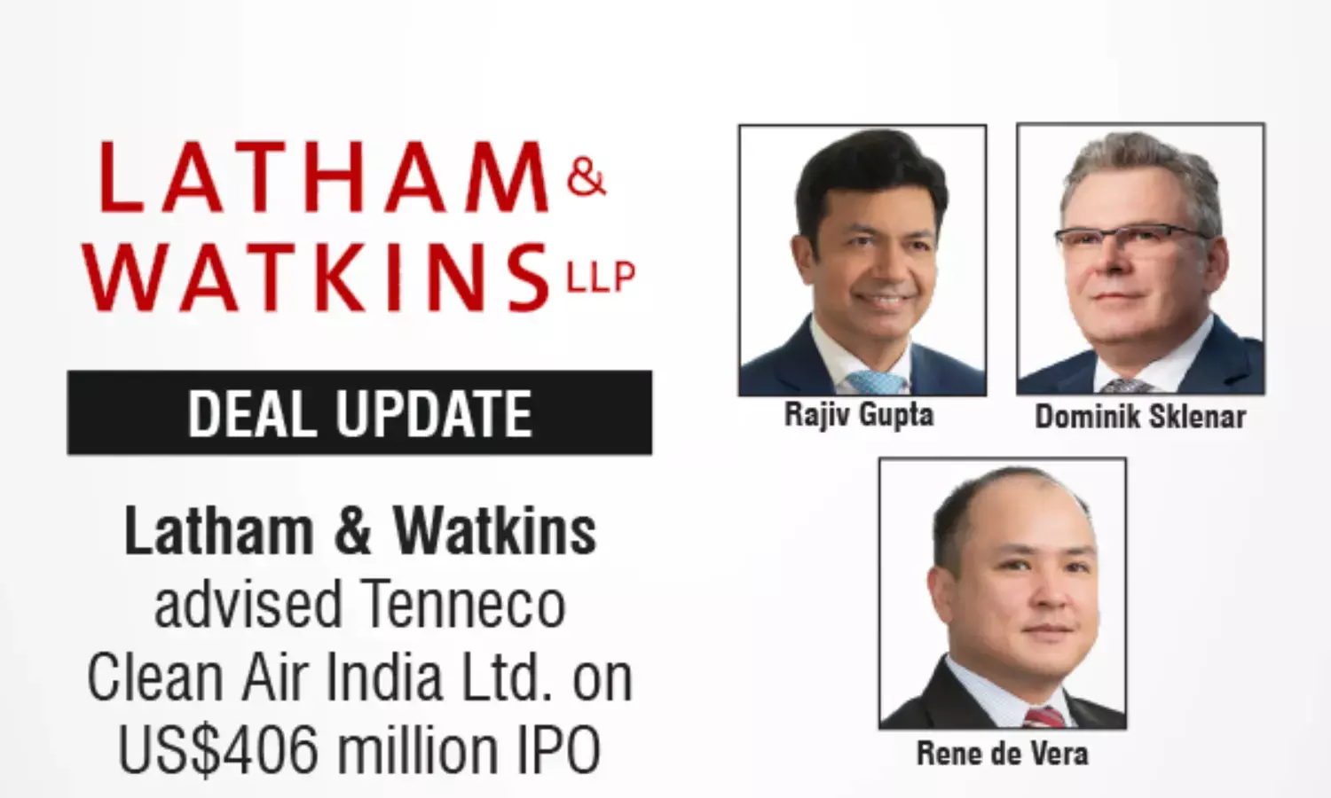 The Global Law firm, Latham & Watkins has advised Tenneco Clean Air India Ltd. on its US$406 million initial public offering (IPO) on the Bombay Stock Exchange (BSE) and the National Stock Exchange of India Limited (NSE).