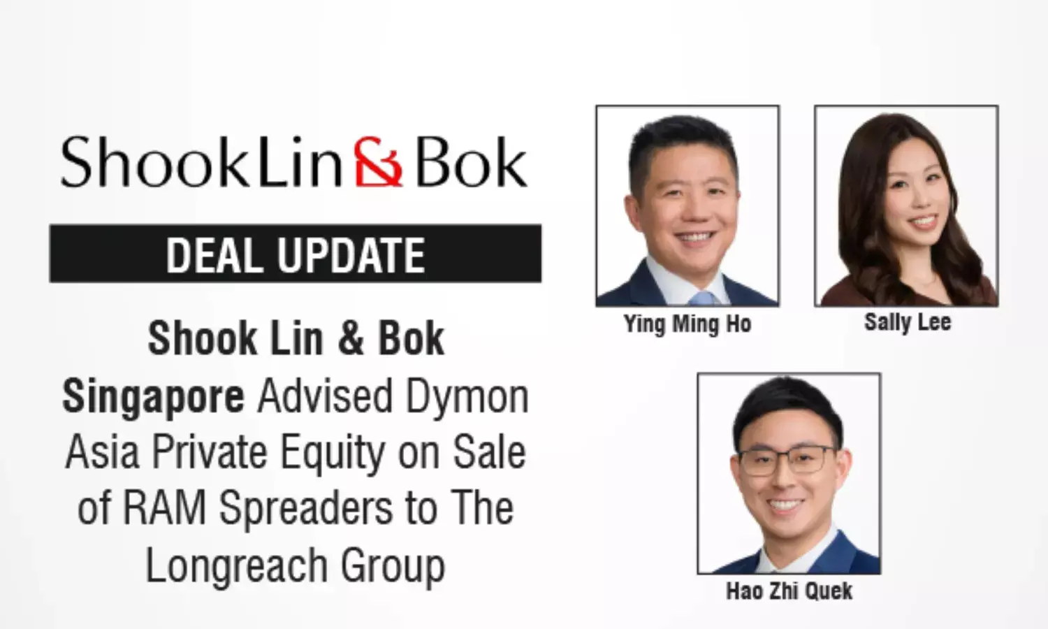 The premier, full-service law firm based in Singapore, Shook Lin & Bok’s M&A team acted for Dymon Asia Private Equity in the sale of 100% of its shares in RAM Spreaders to The Longreach Group.
