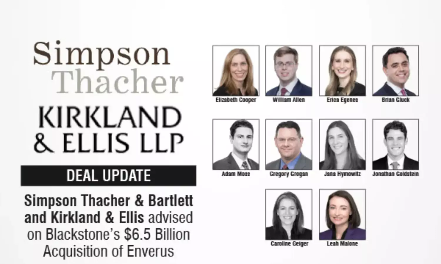 The Simpson Thacher team was led by M&A partners Elizabeth Cooper, William Allen, and Erica Egenes, with support from partners Brian Gluck and Adam Moss (credit), Gregory Grogan and Jana Hymowitz (executive compensation and employee benefits), Jonathan Goldstein (tax), Caroline Geiger (IP), and Leah Malone (ESG).