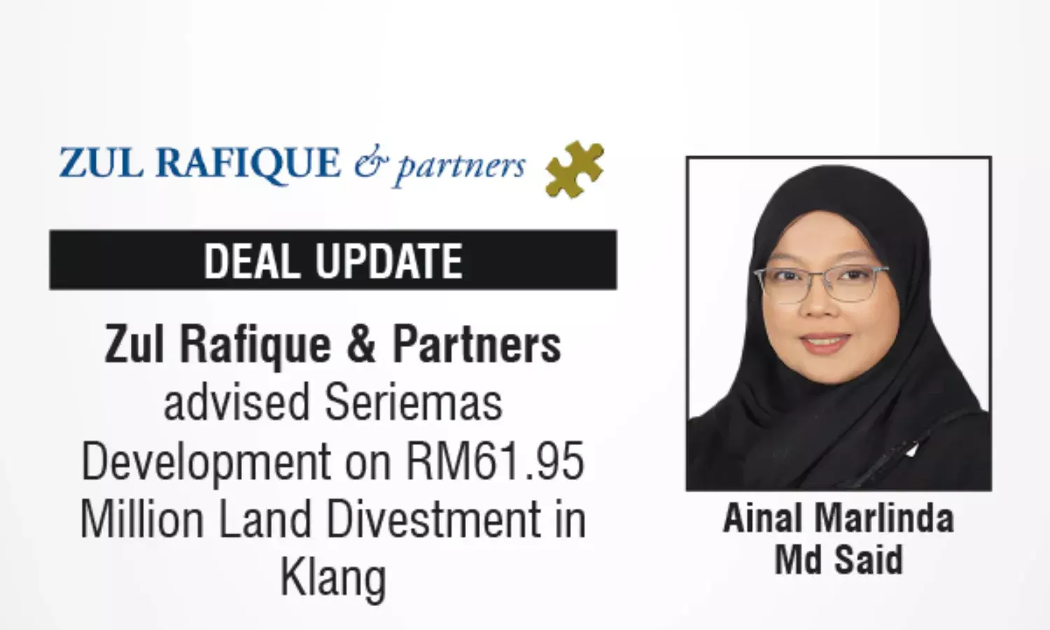 Zul Rafique advised Seriemas Development on RM61.95M industrial land divestment in Klang, Selangor.
