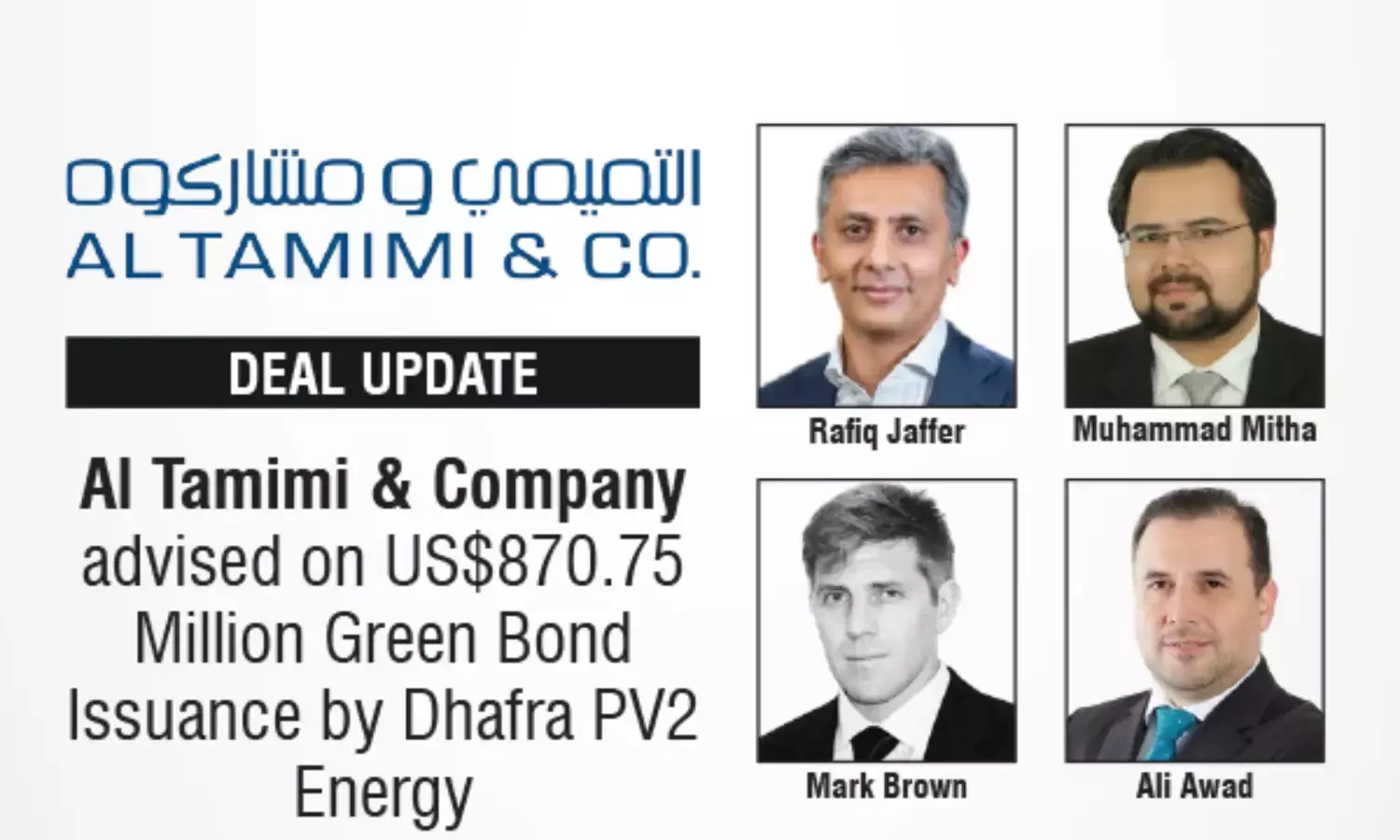 The Al Tamimi & Company deal team was jointly led by Rafiq Jaffer (Partner) and Muhammad Mitha from the Debt Capital Markets practice, along with Mark Brown (Partner) and Marianna Margaritidou (Associate) from the Banking & Finance – Project Finance team.