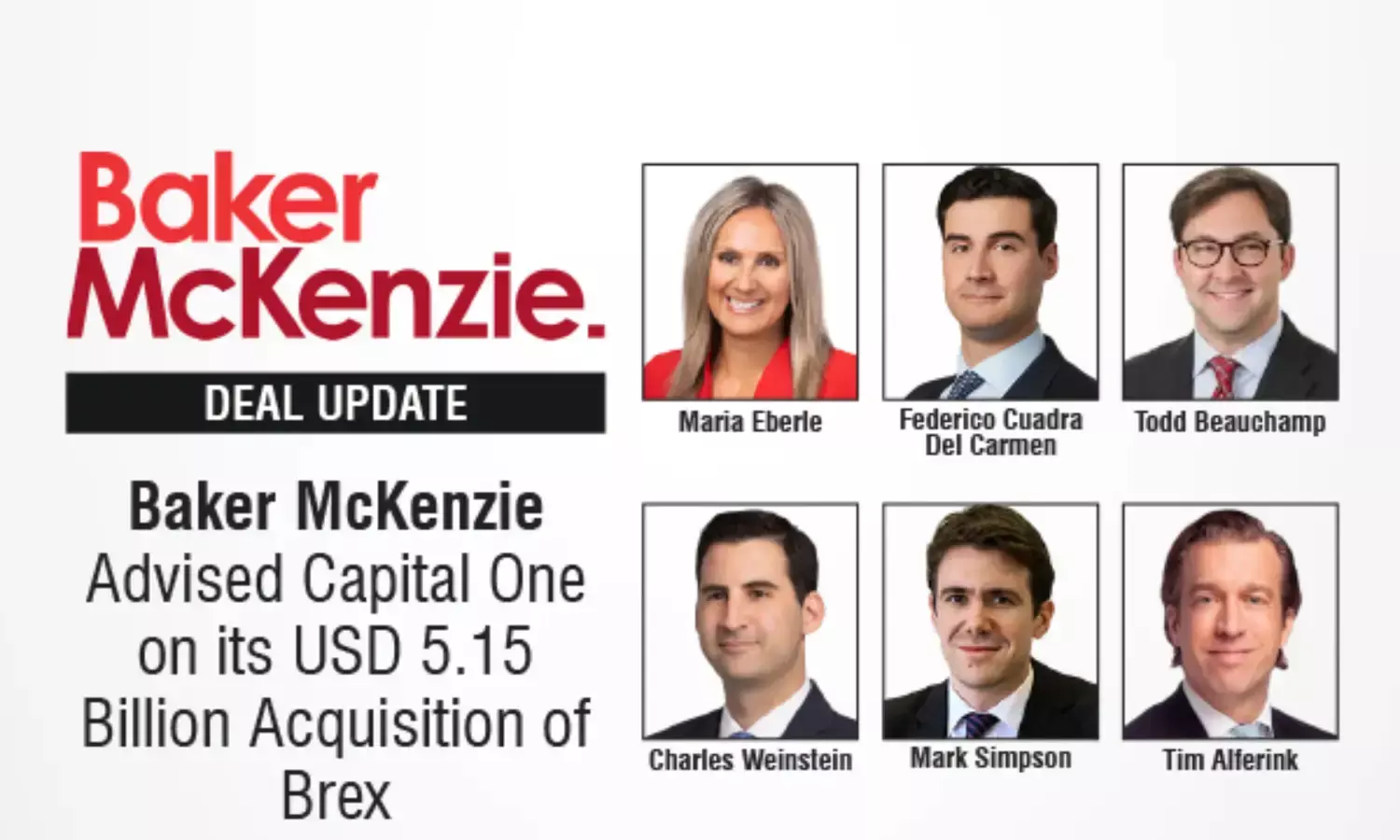 Baker McKenzie is representing Capital One Financial Corporation (NYSE: COF) on its agreement to acquire Brex, an AI native intelligent finance platform, in a cash and stock transaction valued at USD 5.15 billion. The Firm serves as international counsel, advised on foreign legal matters.