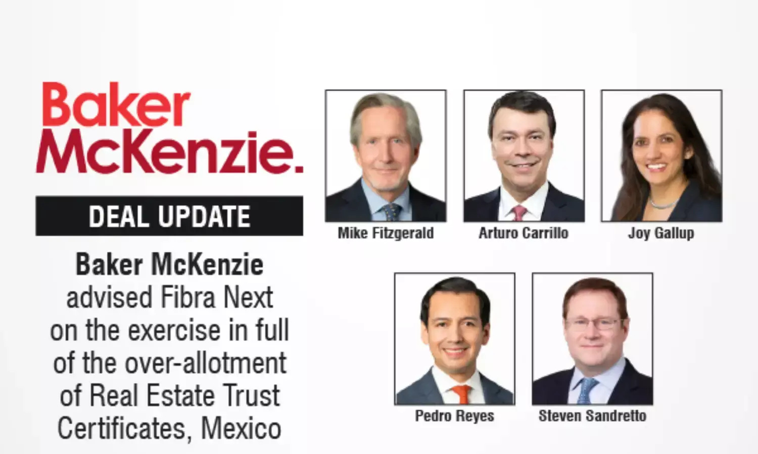 Baker McKenzie advised Fibra Next on full exercise of over-allotment of Real Estate Trust Certificates in Mexico.