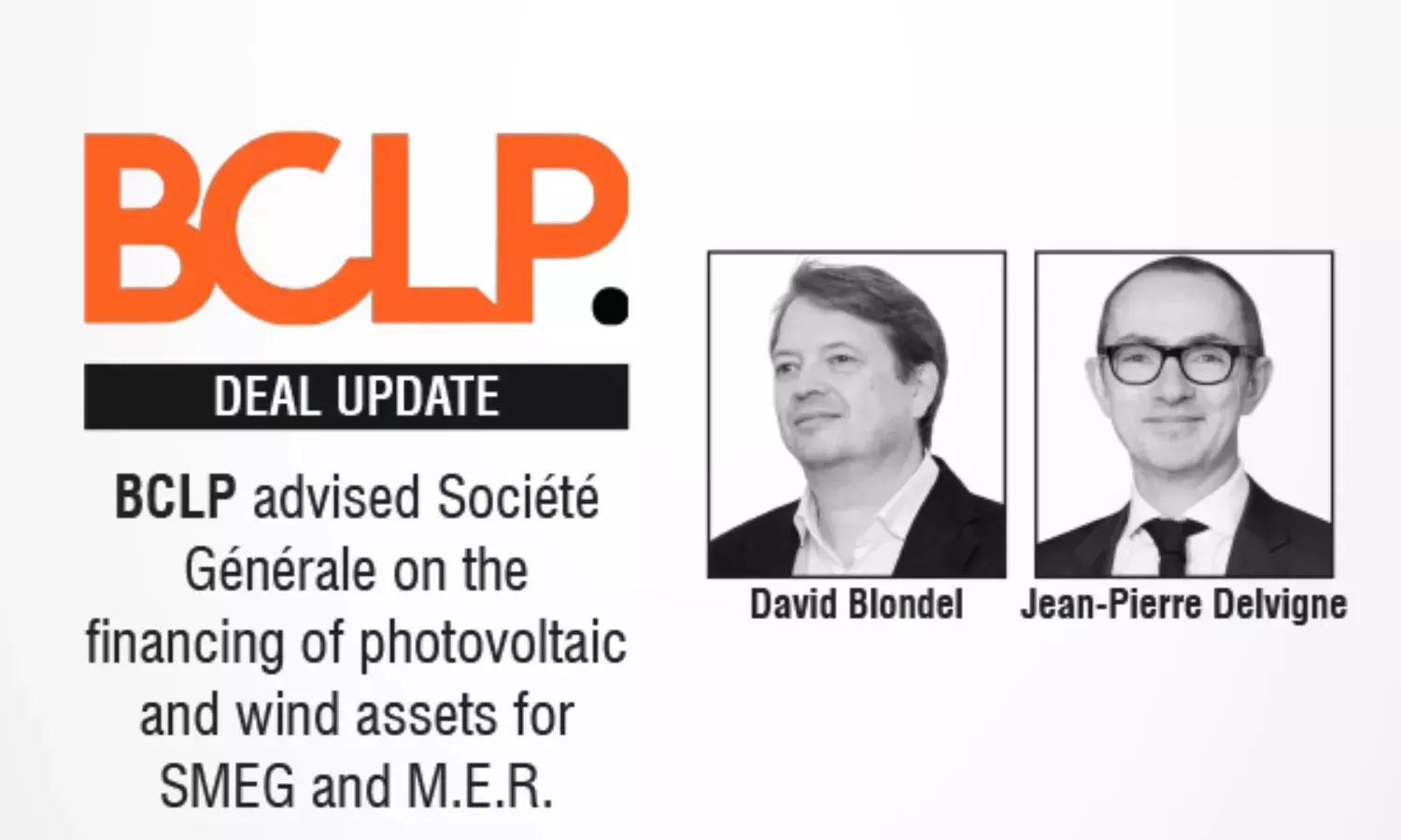 BCLP Advised Société Générale On The Financing Of Photovoltaic And Wind Assets For SMEG And M.E.R.