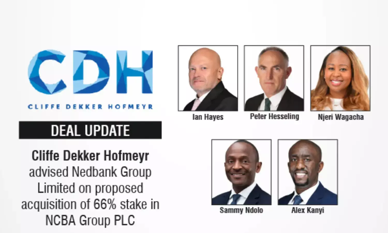 The full-service law firm primarily focused on the African continent, Cliffe Dekker Hofmeyr Inc (CDH), advised Nedbank Group Limited on its proposed acquisition of approximately 66% of the issued shares in NCBA Group PLC from the existing shareholders.