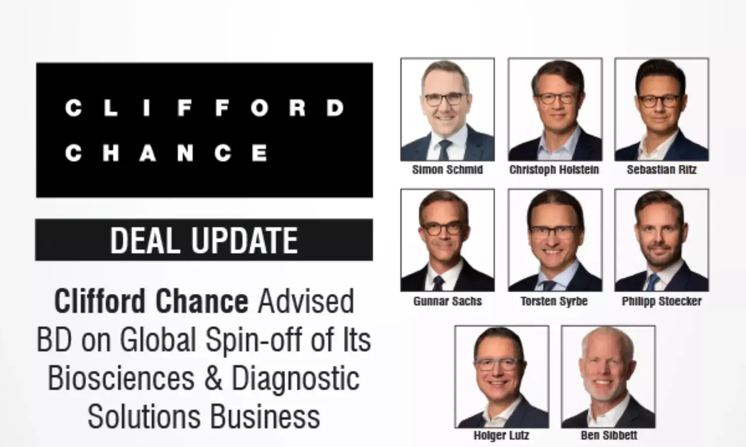 The Clifford Chance team for BD is led by Simon Schmid (Partner) and comprised Christoph Holstein (Partner), Ribana Piontek (Senior Associate) and Varinia Keßler (Senior Associate), Tobias Jenne (Associate/ Corporate/ M&A), Sebastian Ritz (Partner), Alexander Stemmler (Senior Associate), Max Klein (Associate/ Employment), Gunnar Sachs (Partner) and Torsten Syrbe (Partner/ Co-Chair Healthcare/ Life Sciences), Annabel Joschko (Senior Associate) and Pia-Sophie Weber (Associate/ Healthcare/ Regulatory, Düsseldorf), Philipp Stoecker (Partner) and Ahmad Zaheri ( Senior Associate/ Real Estate), Holger Lutz (Partner) and Michael Kümmel (Senior Associate/ Commercial Contracts, Frankfurt). From the firm's New York office Ben Sibbett (Partner) advised with Stephanie Kilmer (Associate), Vicki Ye (Associate) and Michelle Green (Associate/ Corporate/ M&A) on the US separation work.
