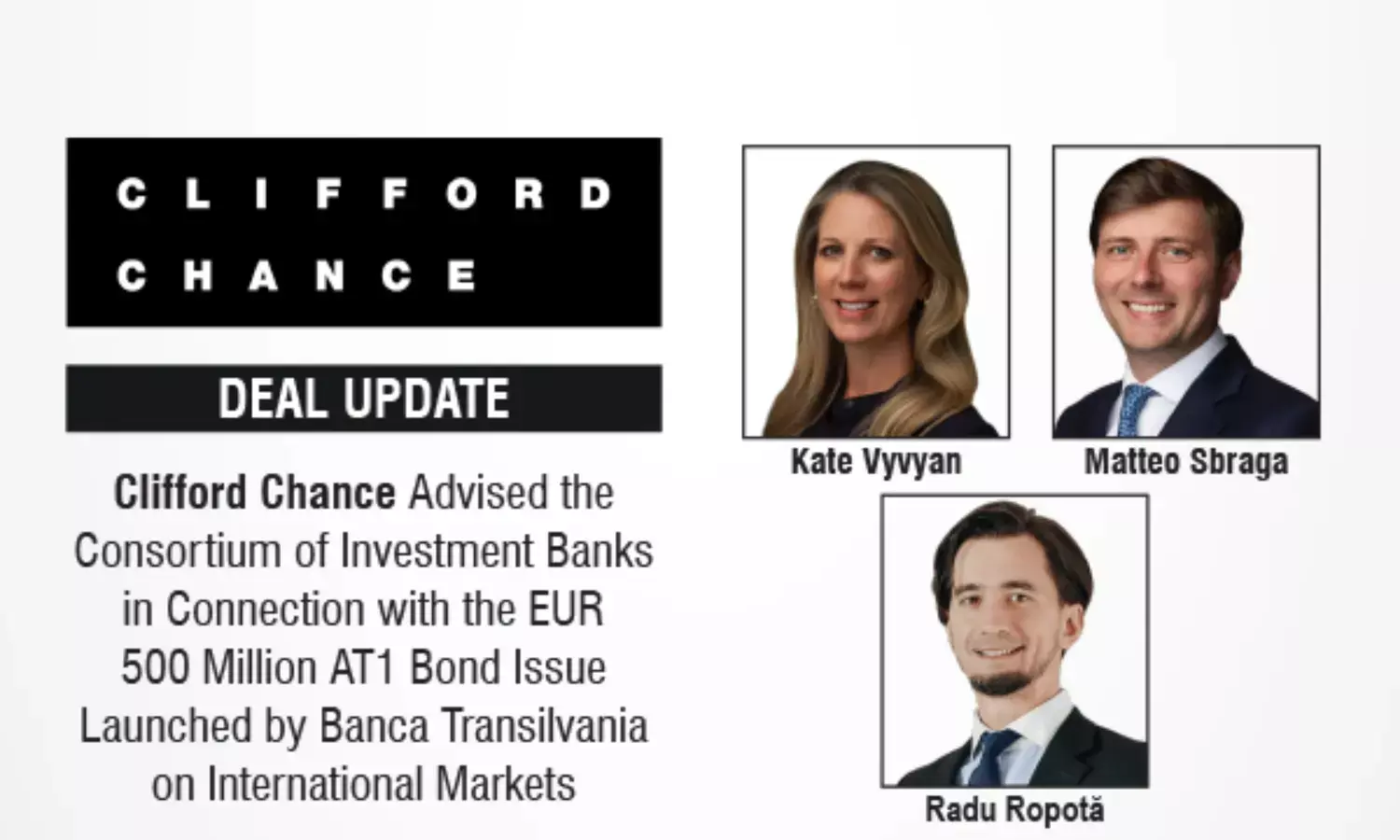A multijurisdictional Clifford Chance team from London and Bucharest has advised the consortium of investment banks in connection with the EUR 500 million AT1 bond issue launched by Banca Transilvania S.A. on international markets, its first ever such issuance and the largest in Central and Eastern Europe.