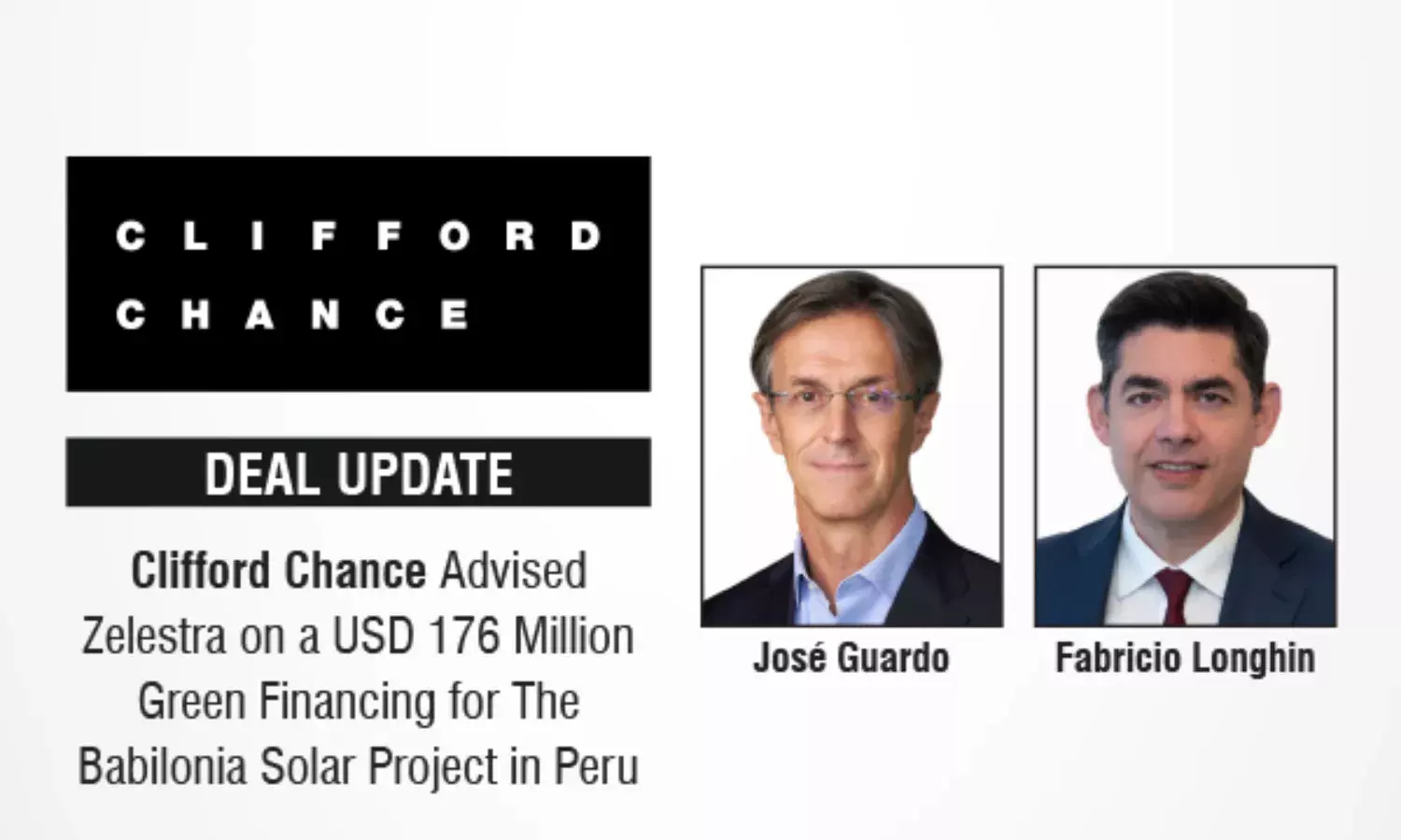 Clifford Chance has advised Zelestra on a USD 176 million green financing agreement, for the development of the Babilonia solar project, a 242 MW facility located in Peru. The financing was provided by Natixis CIB and BBVA Perú.