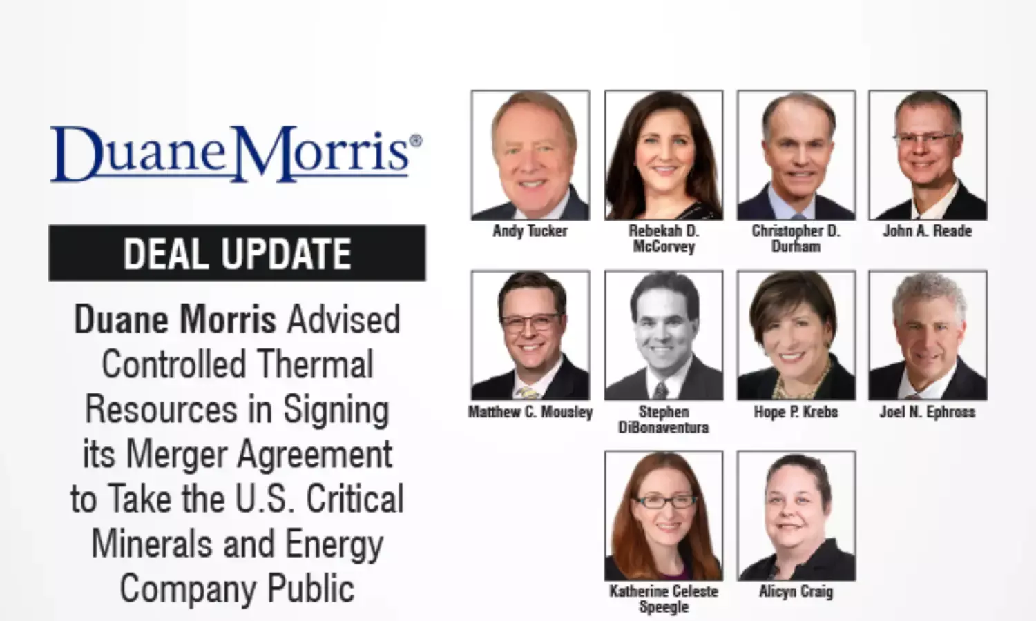 Duane Morris Advised Controlled Thermal Resources in Signing its Merger Agreement to Take the U.S. Critical Minerals and Energy Company Public