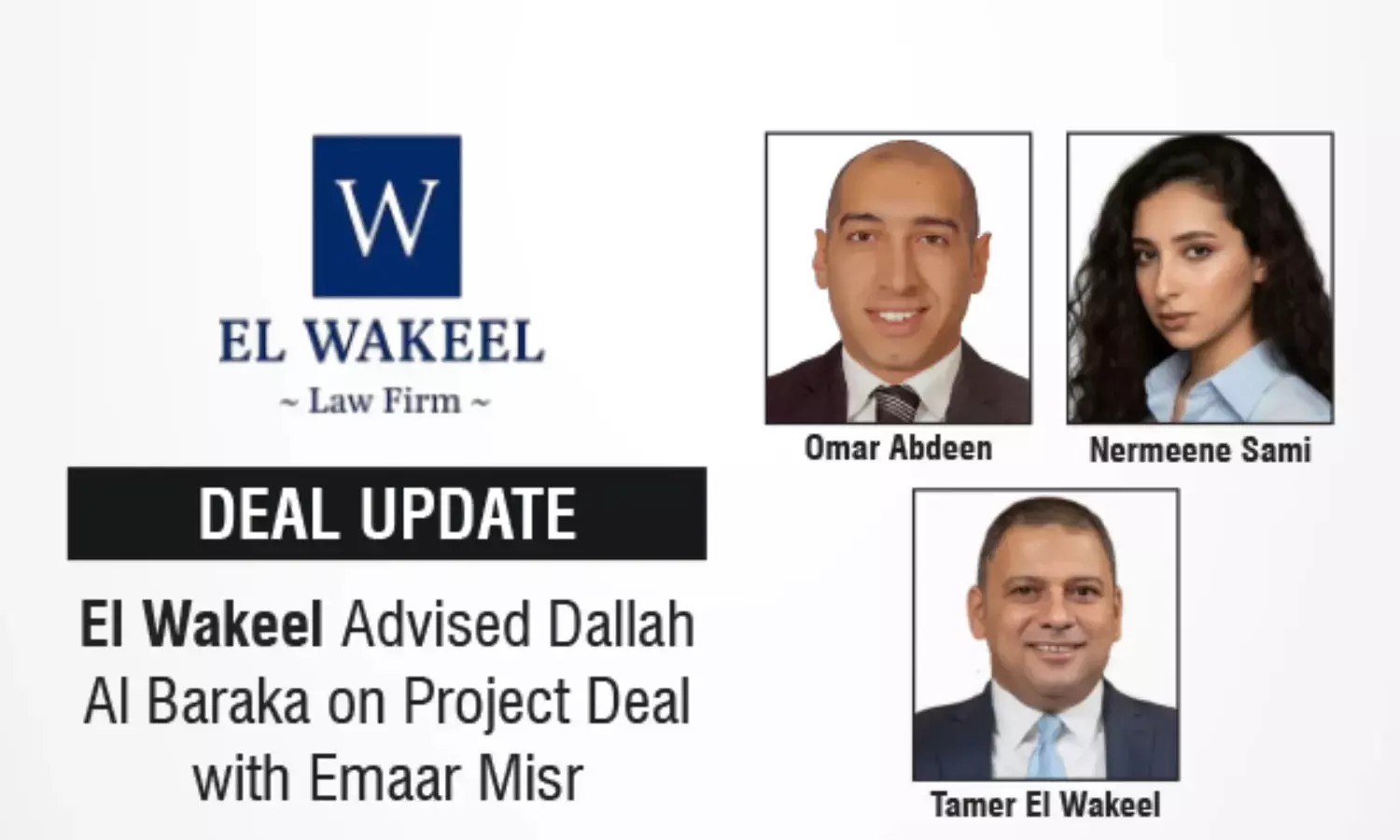 The El Wakeel Law Firm team was led by Omar Abdeen, working alongside Nermeene Sami and under the supervision of the firm’s Managing Partner Tamer El Wakeel.