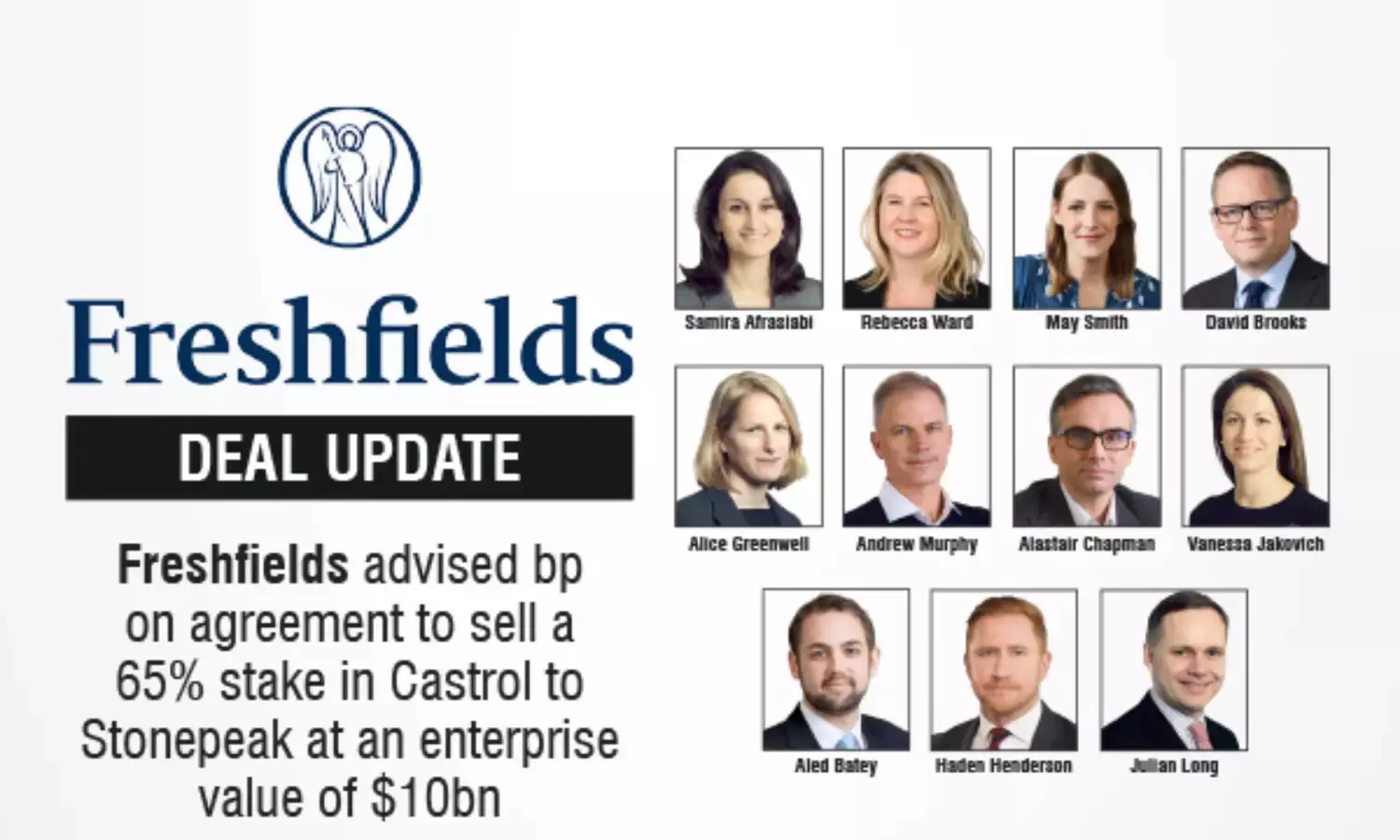 Global law firm Freshfields advised bp on its agreement to sell a 65% shareholding in Castrol to Stonepeak, at an