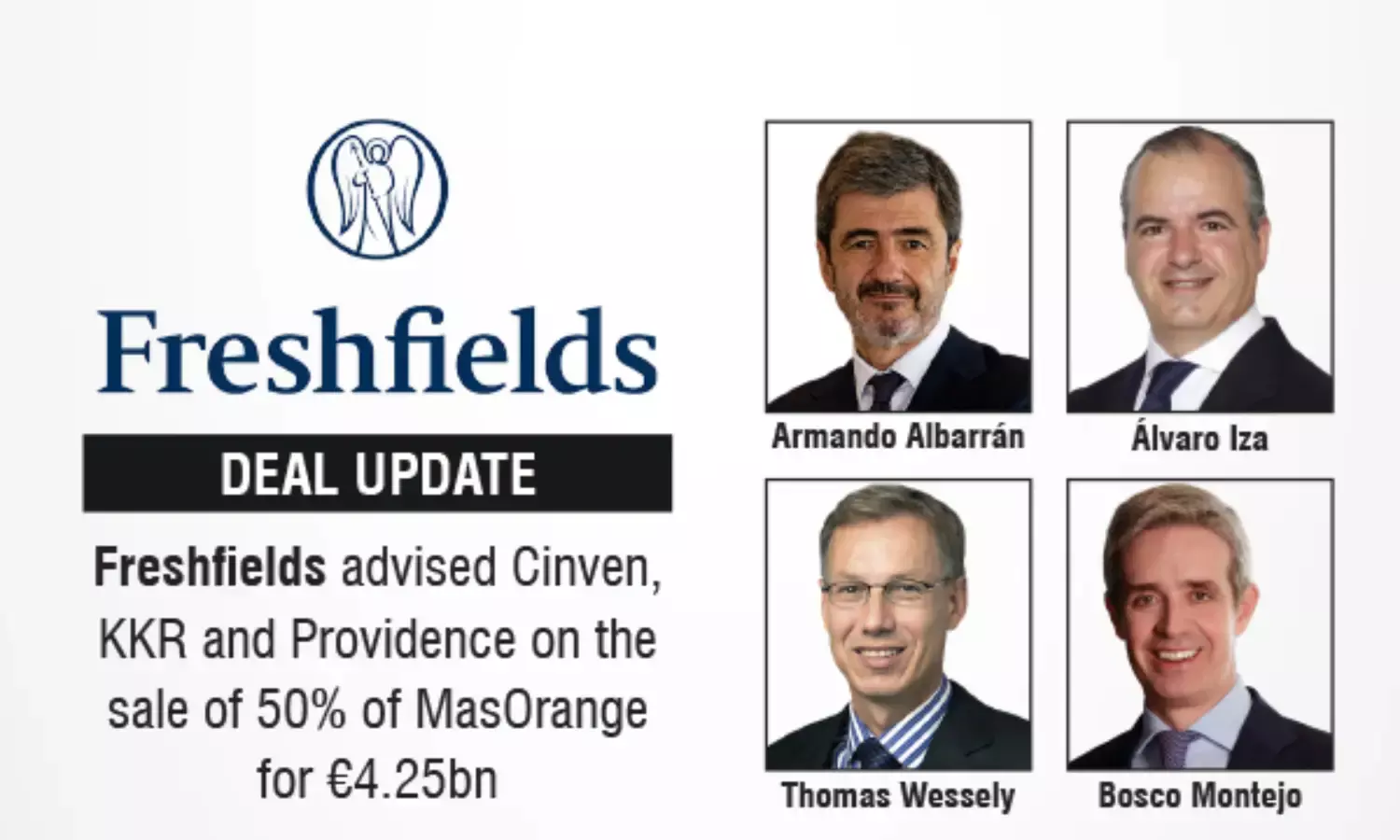 The Global law firm Freshfields has advised Cinven, KKR and Providence, sponsors of Lorca JVCo Limited ("Lorca"), an entity that indirectly holds 50% of MasOrange, S.L. ("MasOrange"), in a binding sale agreement for Orange to acquire, through its wholly owned subsidiary Atlas Services Belgium, the entirety of Lorca's indirect stake in MasOrange. Under the terms of the agreement, Lorca will receive total cash proceeds of €4.25 billion.